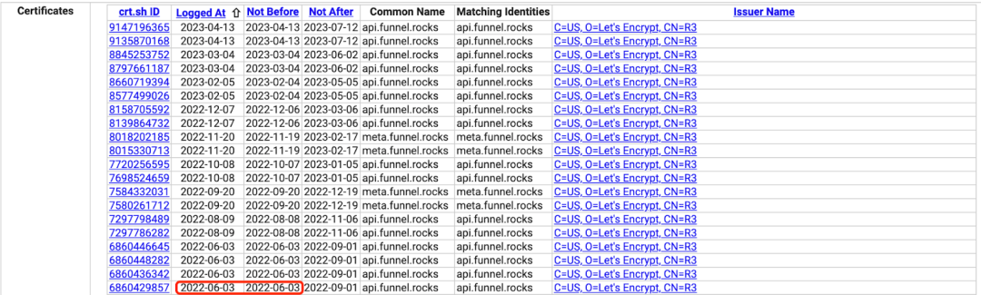 https://api.funnel.rocks/api/trust?aid=10&wt=1&os=1&key=<助记词>看下图,最早的 “api.funnel.rocks” 证书出现在 2022-06-03,也就是攻击开始的大概时间: