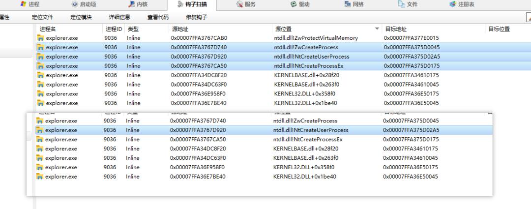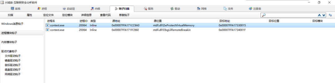 但是在写内存的时候,发现 VirtualProtect 一直调用失败,拿火绒剑扫了一下,发现 VirtualProtect 被下了钩子。