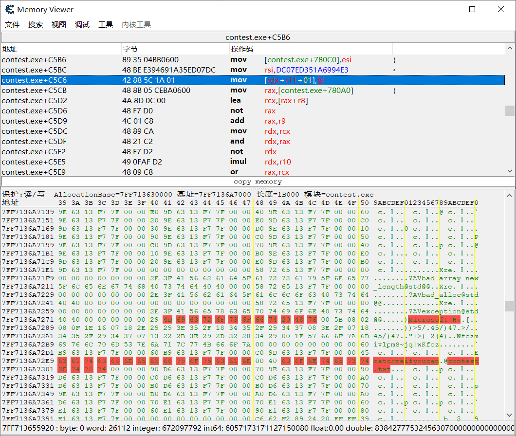 通过参数分析找到了内存的位置,通过仔细观察,发现和初赛的flag:catchmeifyoucan 十分相似。