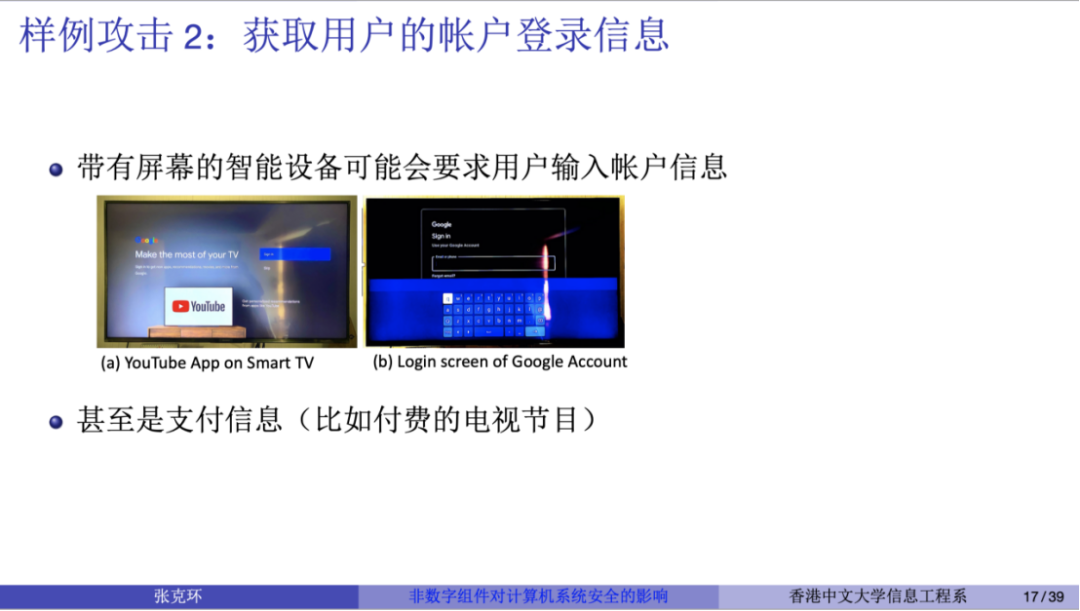 在介绍完第一个攻击案例后,张老师介绍了第二个后果更加严重的攻击案例——获取用户的账户登录信息。带有屏幕的智能设备,如智能电视等,会要求用户输入账户信息甚至支付信息(比如付费的电视节目)。而且,张老师调研发现,这类智能设备上的绝大部分APP都支持红外遥控+虚拟键盘的操作方式。