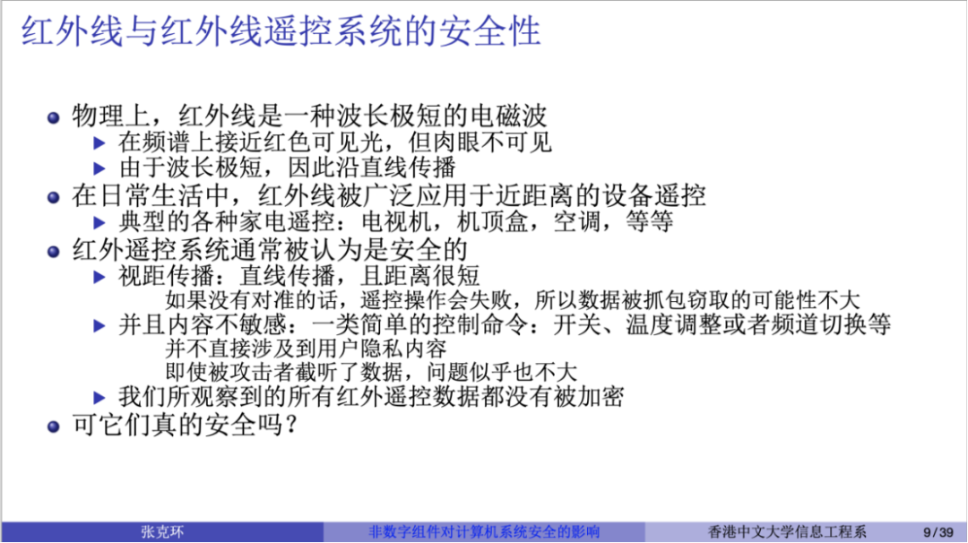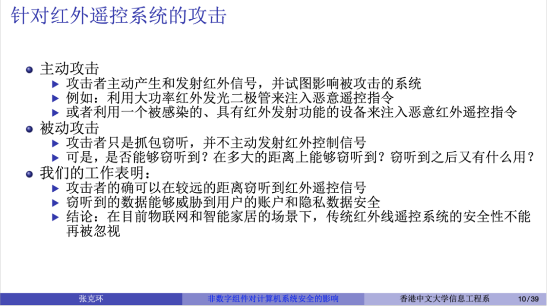 围绕非数字组件对计算机系统安全的影响,张老师展开介绍了一些自己的相关研究成果。首先是详细介绍了发表于网络安全顶会USENIX Security 2023的针对红外遥控系统的安全性研究。在日常生活中,红外线被广泛应用于近距离的设备遥控,如电视机,空调等。红外遥控系统通常被认为是安全的,因为其视距传播的特点,所以数据被抓包窃取的可能性不大。并且传输内容也不敏感,主要是一些简单的控制命令,不直接涉及用户隐私内容,所以通常不会被加密传输。