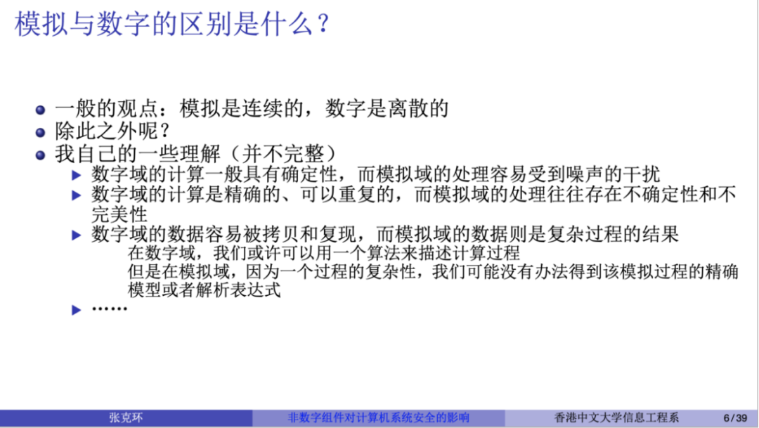 紧接着,张老师介绍了对物理的热爱对自己的科研研究的影响。张老师认为我们的世界一定程度上是可以视作是模拟(非数字化)的,而我们所使用的计算机是数字的,那么作为安全研究人员,所关心的问题就是这些模拟(非数字化)组件对于计算机系统的安全有什么样的影响呢?这些模拟组件,如LCD屏幕,麦克风,扬声器等,都可能被用来发起对系统的安全攻击或者增强系统安全的防御。