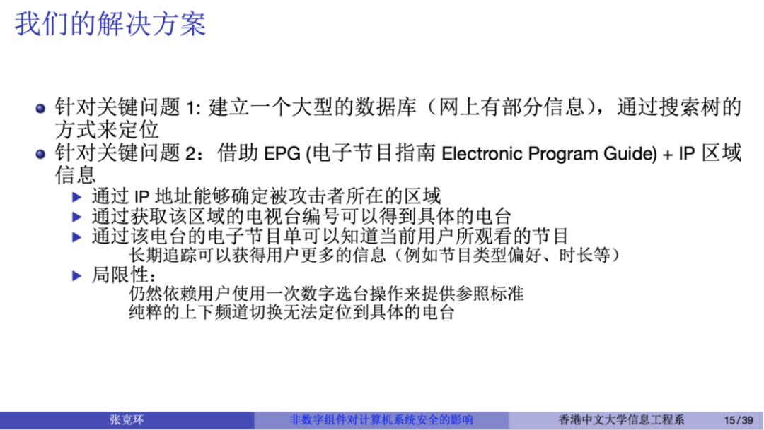 随后,张老师介绍了他们提出的解决方案,。针对第一个问题,他们选择建立一个大型的数据库,基于现有数据进行控制命令识别。针对第二个问题,他们选择借助电子节目指南和IP区域信息进行辅助推测。