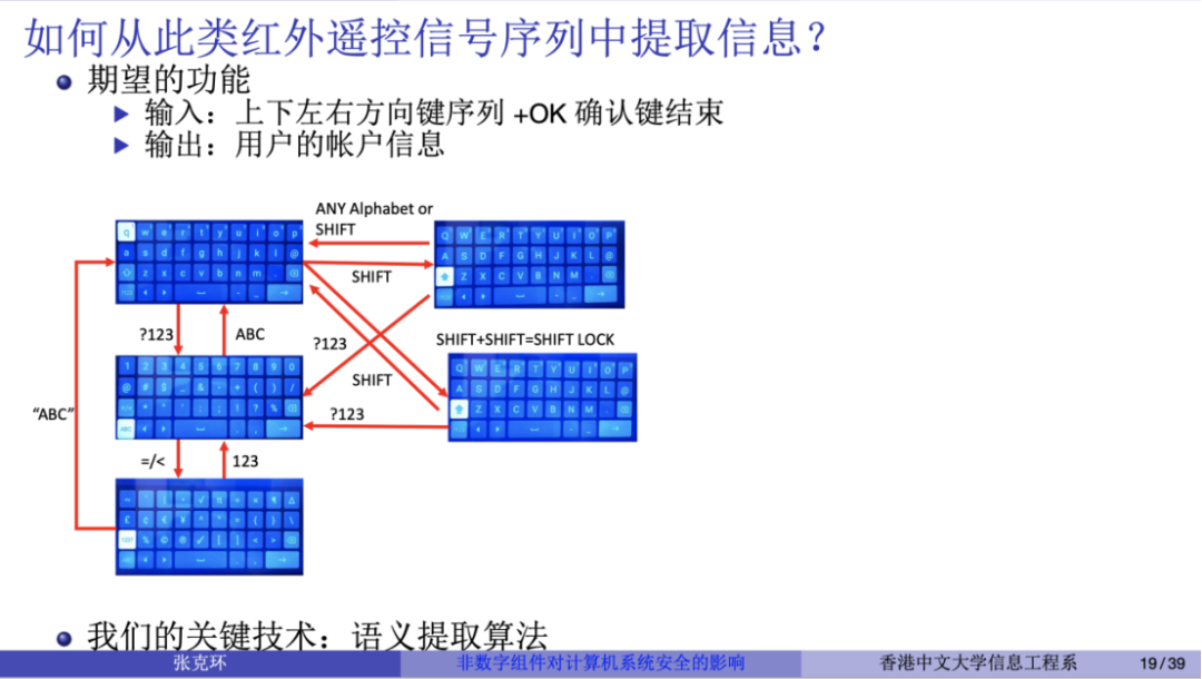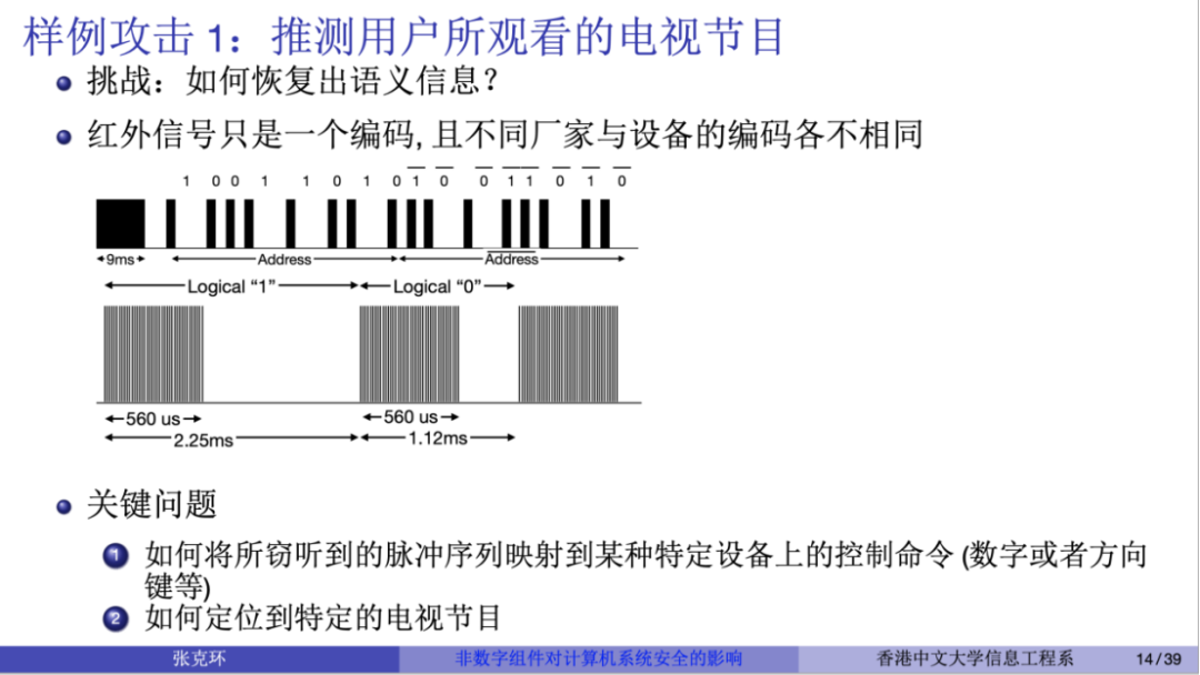 为了更形象的展示这类攻击的安全后果,张老师接着介绍了两个具体的攻击案例。第一个是推测用户所观看的电视节目。想要达到预期的攻击效果,关键挑战在于如何恢复出语义信息。红外信号只是一个编码, 且不同厂家与设备的编码各不相同。这里两个关键问题在于如何将所窃听到的脉冲序列映射到某种特定设备上的控制命令 (数字或者方向 键等)以及如何定位到特定的电视节目。