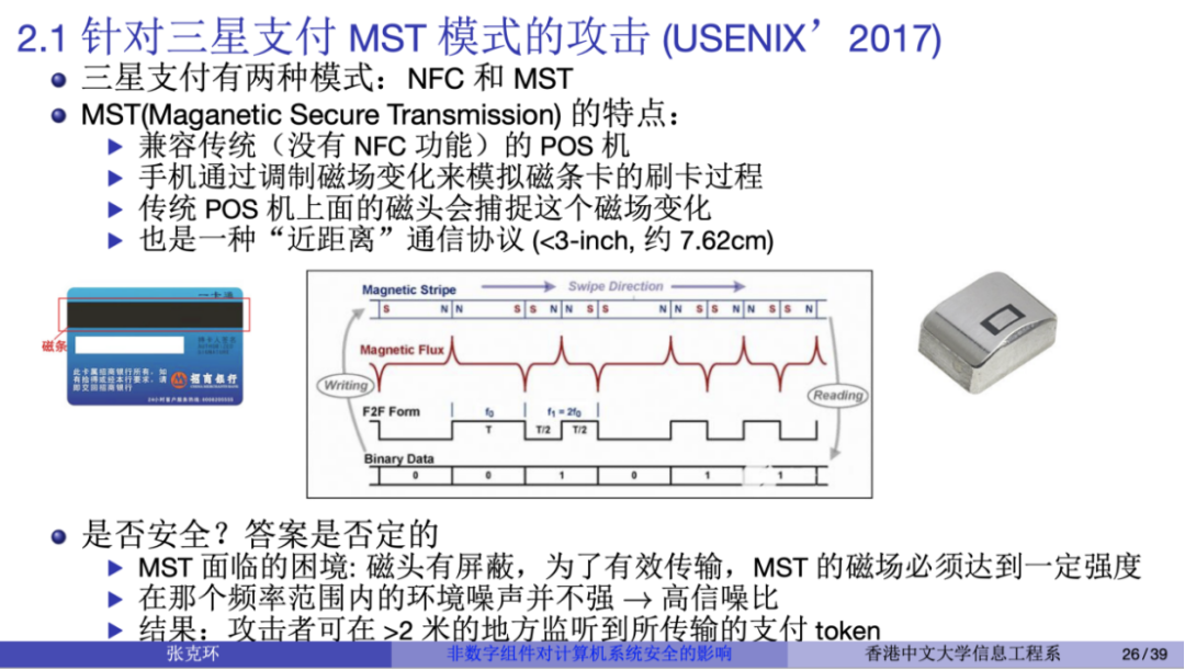 1.针对三星支付 MST 模式的攻击,该研究工作发表于USENIX Security 2017,攻击者可以实现在超过2米的距离窃听到三星支付所传输的支付token。