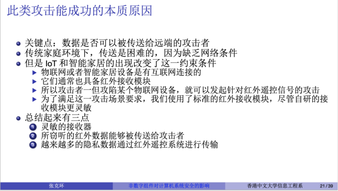 随后,张老师分析了此类攻击能够成功的本质原因。张老师认为IoT和智能家居的出现使得将近距离传输使用的红外信号传输给远端攻击者成为了现实,这也是一个新型技术演变对传统安全模型产生了破坏性影响的典型案例。
