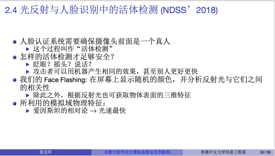 4.光反射于人脸识别中的活体检测,该研究成果发表于NDSS 2018,利用反射光信息帮助人脸识别系统确定摄像头前是否为真人。