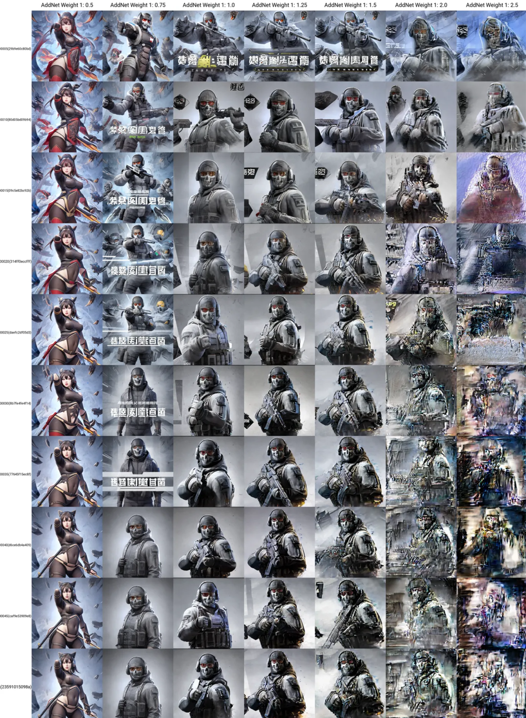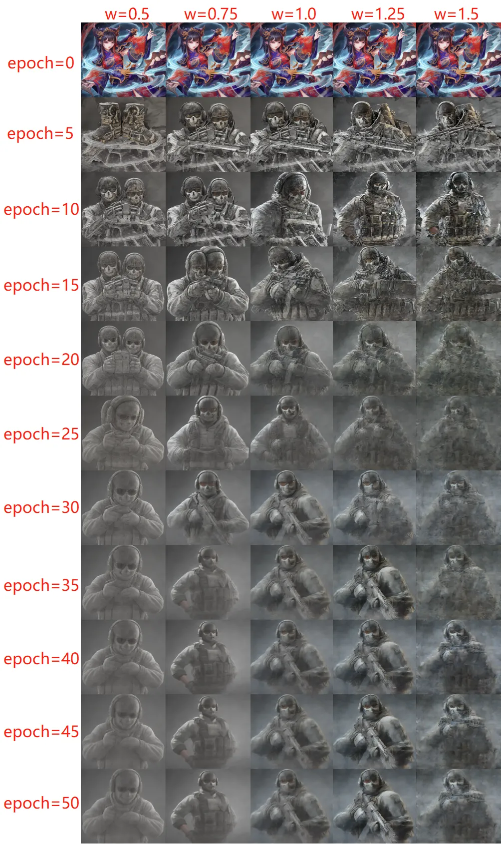 为了方便与前文进行对比,我选择 ghost 的数据集进行训练,下图展示了不同的 “训练 step“ x ”lora 权重” 的效果:
