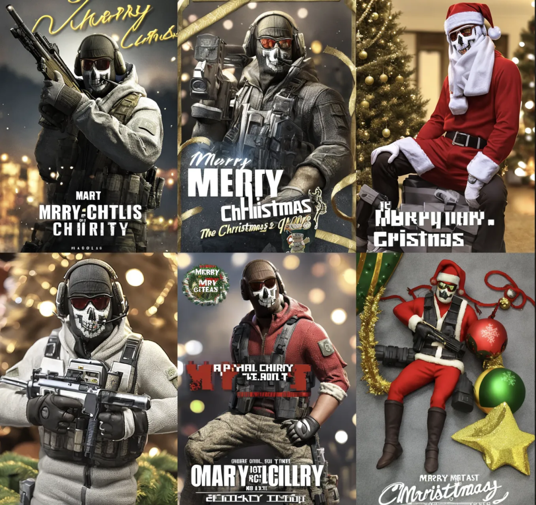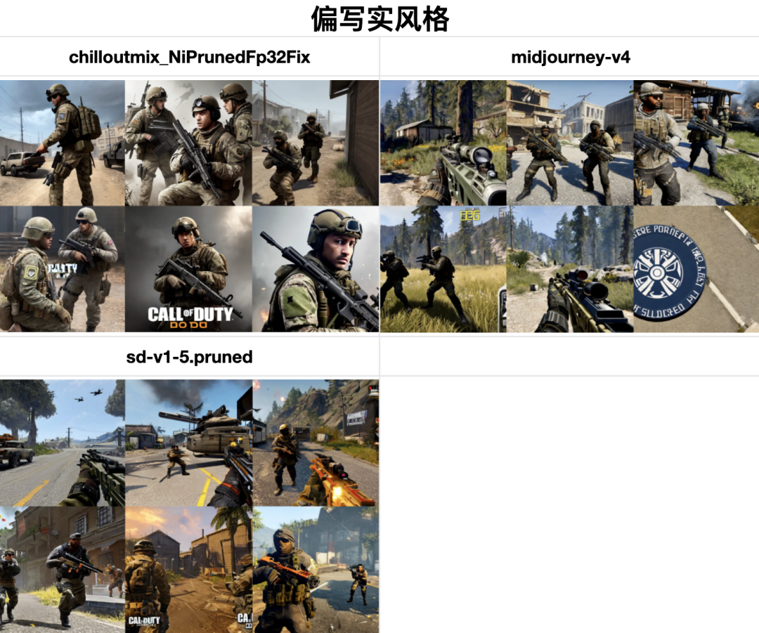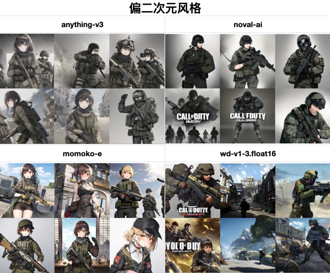 我将其按风格分成两大类:偏二次元风格 和 偏写实风格。下面我们分别以“Call of Duty”作为 prompt,看一些不同模型生成图片的效果: