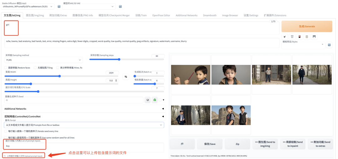 从文本框或文件载入提示词 :顾名思义,就是让用户能够从文件中导入提示词。举个例子我们在上面的 prompt 中输入 girl,在下面的文本框中输入 boy,结果生成的图片是男孩,说明通过“脚本”导入的提示词覆盖了在上面文本框中的提示词