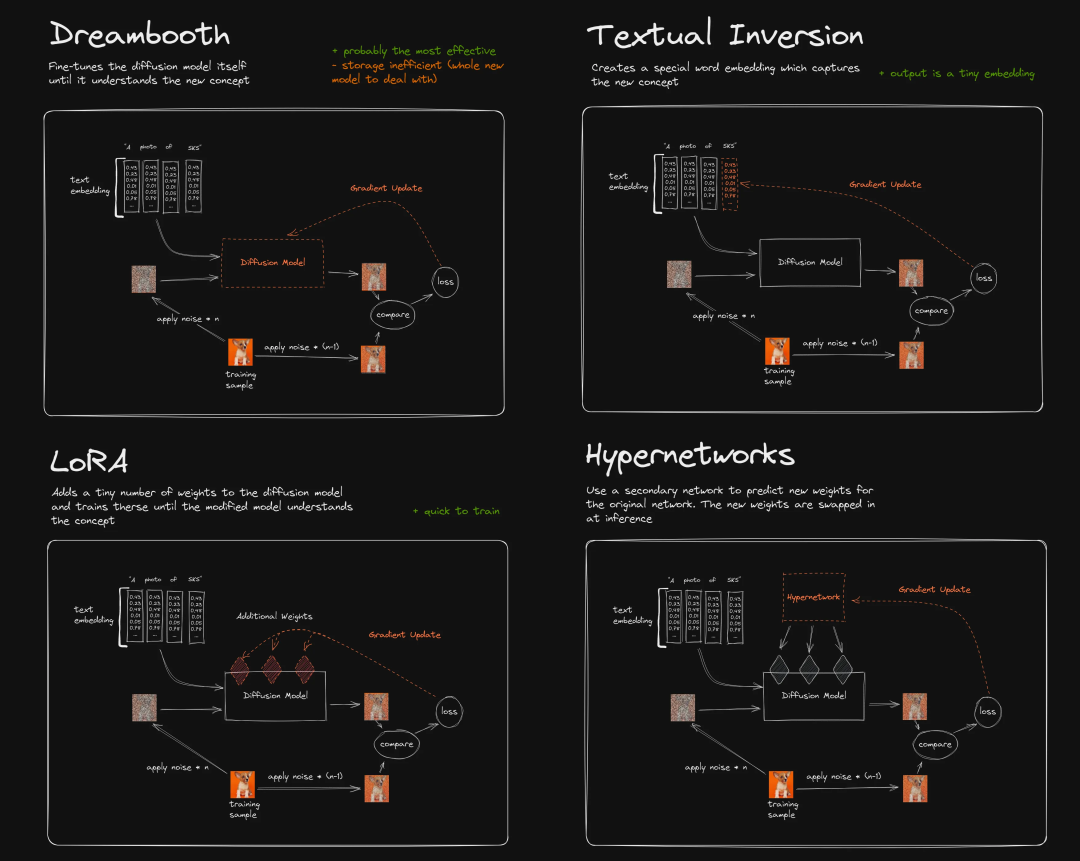 由于 Textual Inversion 和 HyperNetworks 的训练难度较大,效果也通常不尽如人意,目前并没有成为模型微调的主流选择。所以下文我们主要介绍 Dreambooth 和 LoRA(以及 LoRA 的变体 LyCORIS)相关的技术原理、特点、使用场景、使用方法。