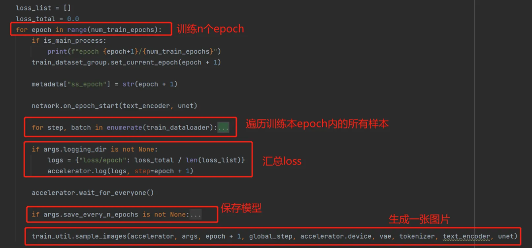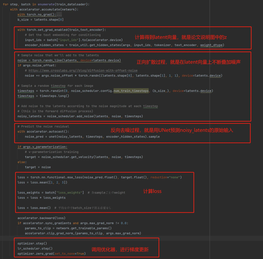 虽然具体使用推荐直接用 WebUI 进行训练,就已经很方便了。但是为了更加直观的理解他具体做了什么,我们还是看一下 sd-scripts 项目中的关键代码: