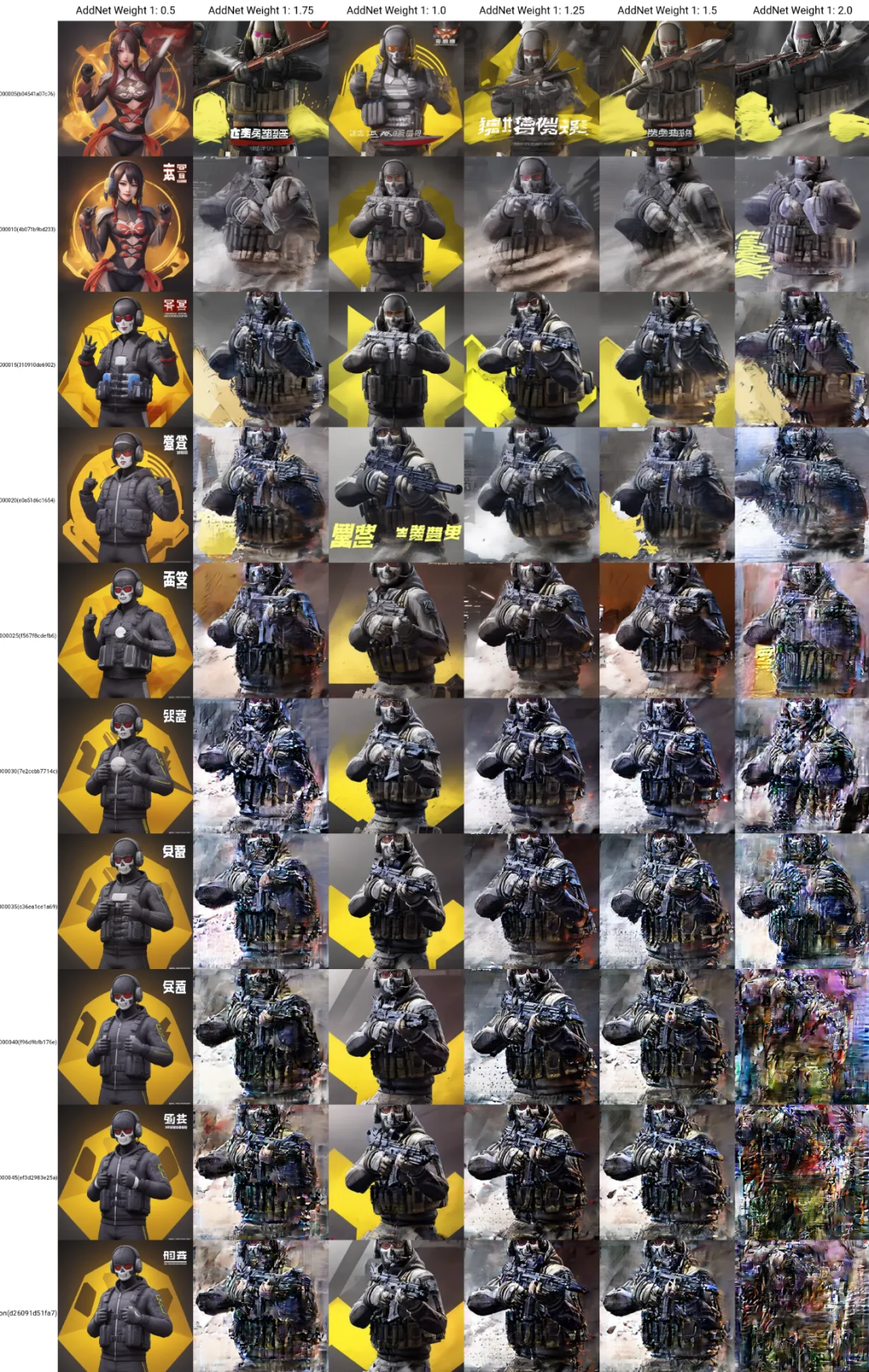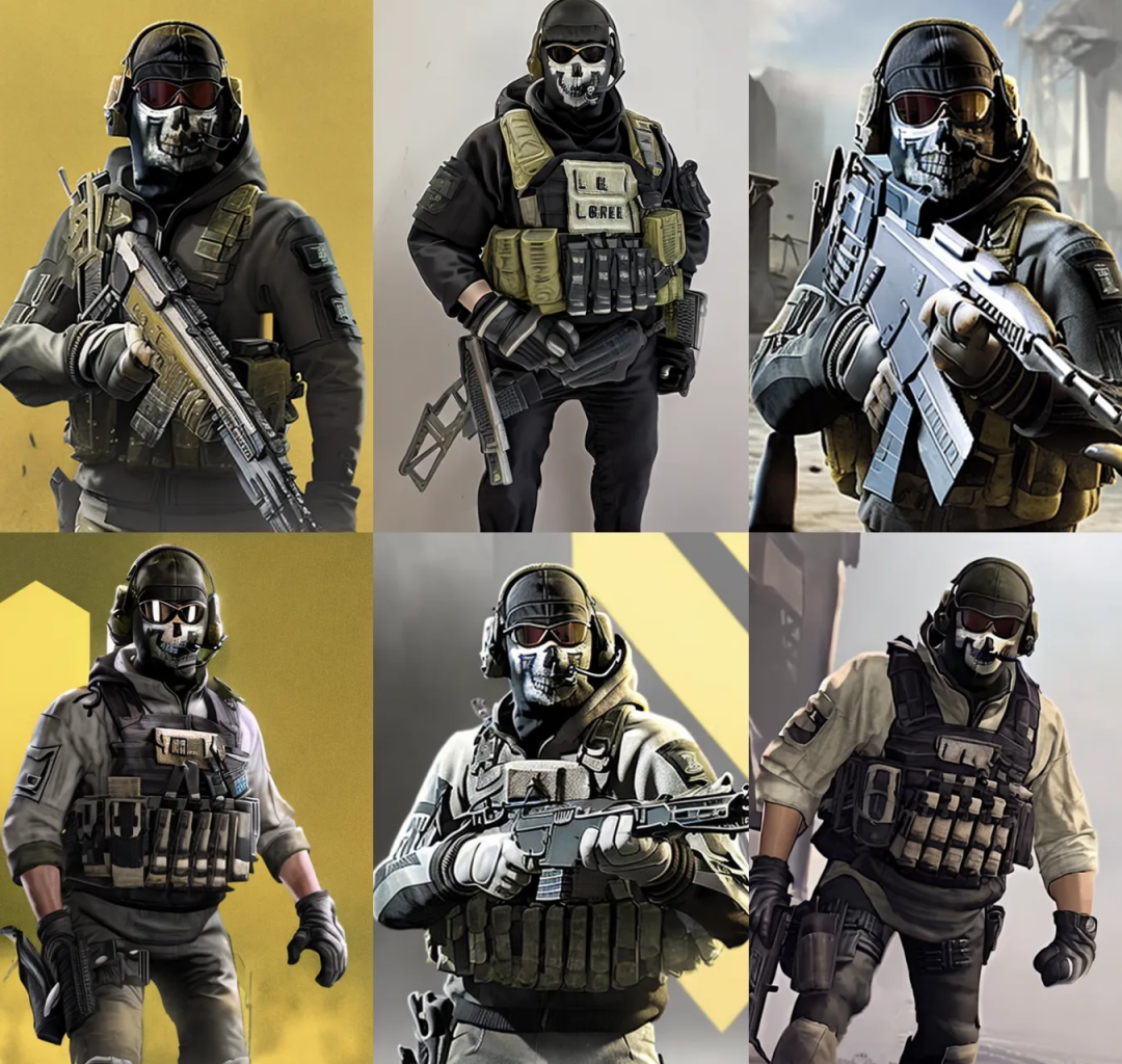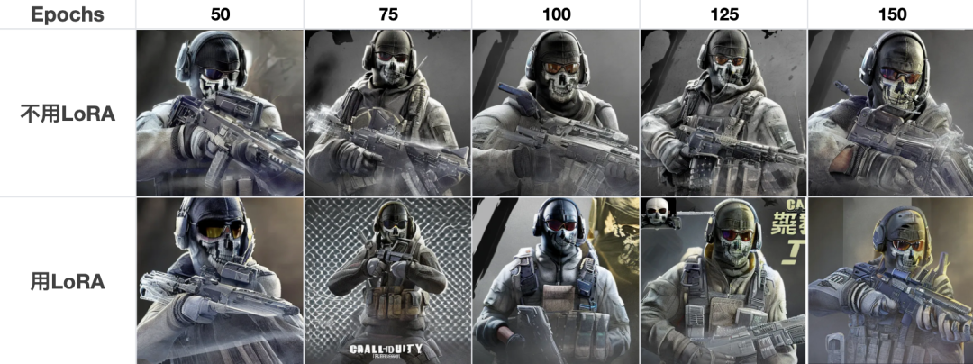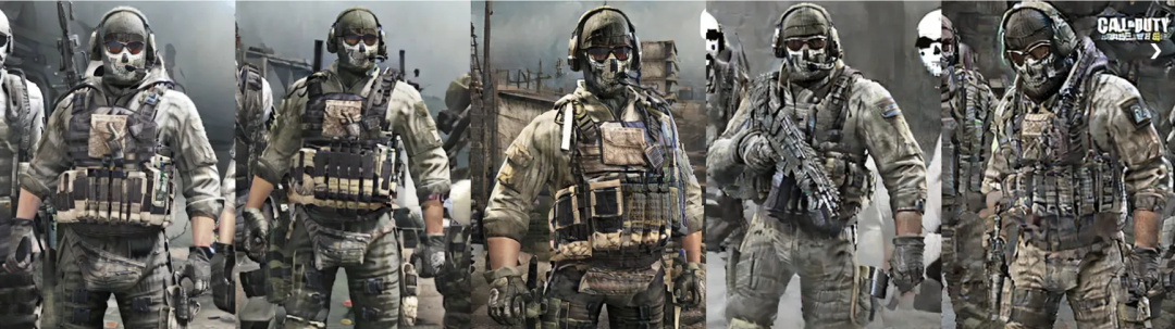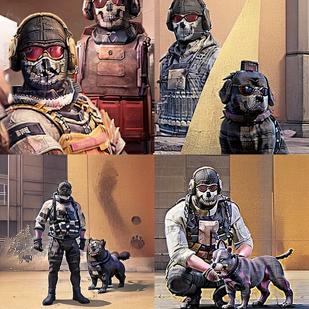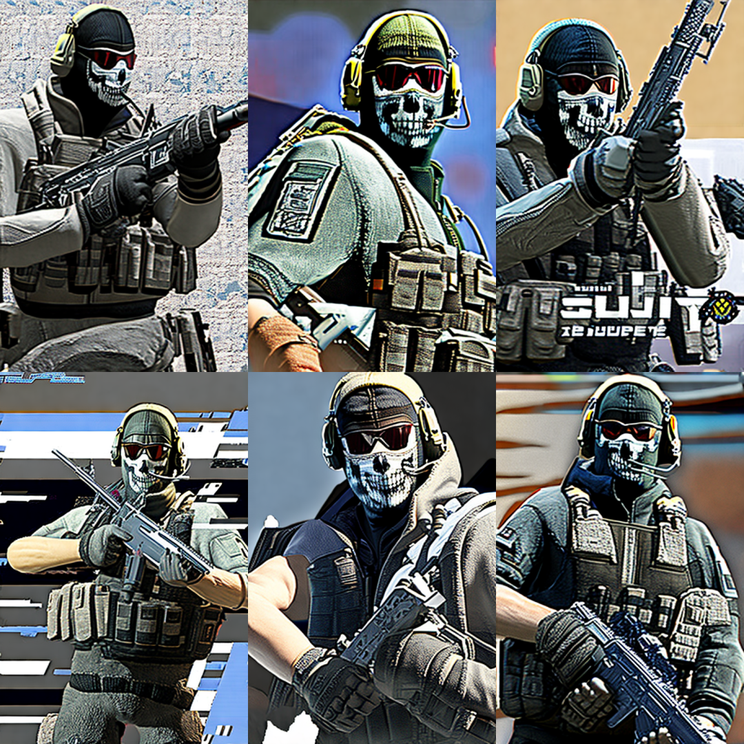 模型已经学习到了,“Ghost”是一个带着面罩+护目镜+耳罩的军人(而不是鬼魂),但是目前还没有学习到 ghost 面罩上的骷髅图案。想必在更多数据以及更加精细化的微调后,是能够做到的。下面是选取了 50 张经过简单清洗的样本,进行训练的结果,可见模型已经能够学习到 ghost 的很多细节了,而且成功剔除了无关的文字。