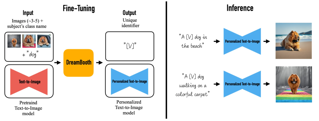 We first fine-tune the low-resolution text-to- image model with the input images and text prompts containing a unique identifier followed by the class name of the subject (e.g., “A [V] dog”)