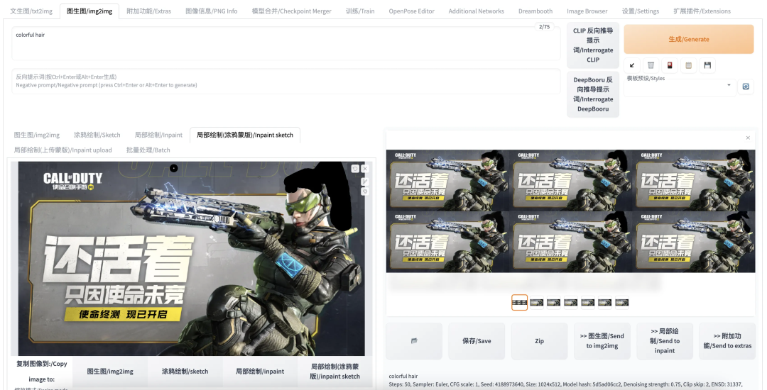 局部绘制-涂鸦蒙版(inpaint sketch):其实也是一种局部绘制(inpaint),区别之处在于在局部绘制(inpaint)中,用户涂黑的部分表示该部分可以被重绘;而在局部绘制-涂鸦蒙版(inpaint sketch)中,用户涂鸦的部分不仅表示可以重绘,用户涂鸦的内容还会成为图像生成的内容来源。下例中依然涂抹了角色的头发,并且在 prompt 中写入“colorful hair”试图让模型生成彩色头发:
