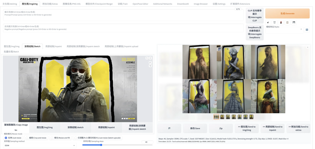 除了进行 image2image,还提供了其他功能,如涂鸦绘制(sketch)、局部绘制(inpaint)等: