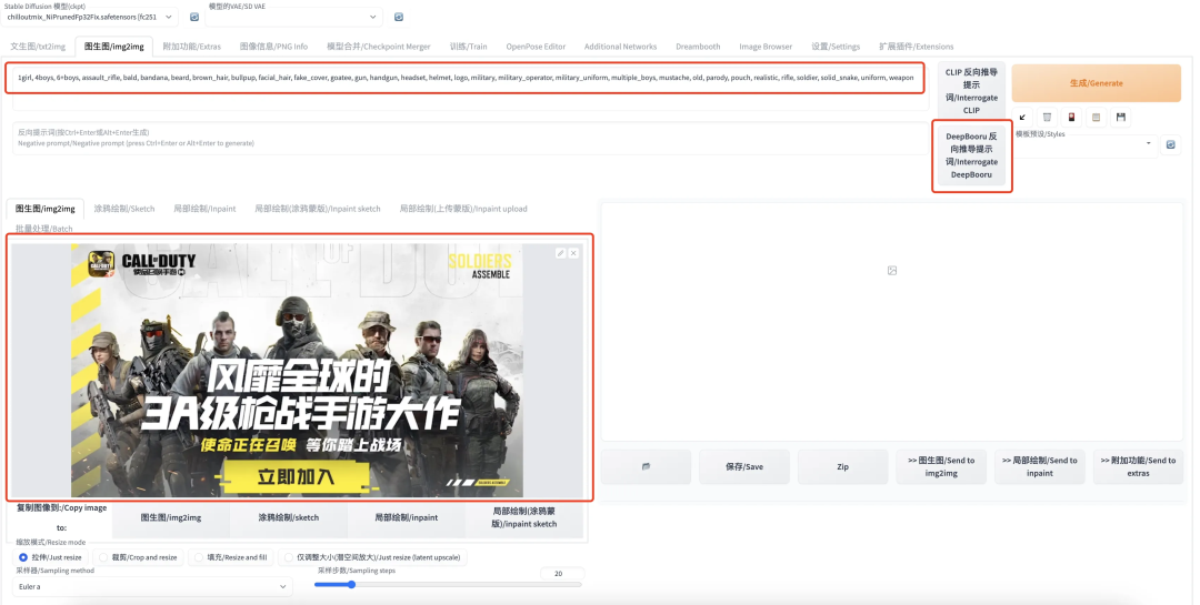 对于一些通用的超参数,如:采样器、采样步数在前文 text2image 中就已经介绍过了,这里介绍一下 image2image 特有的一个功能:Deepbooru 反向推导提示词。即输入一张图片,输出该图像对应的提示词,以求根据该提示词能尽可能的还原输入图像。