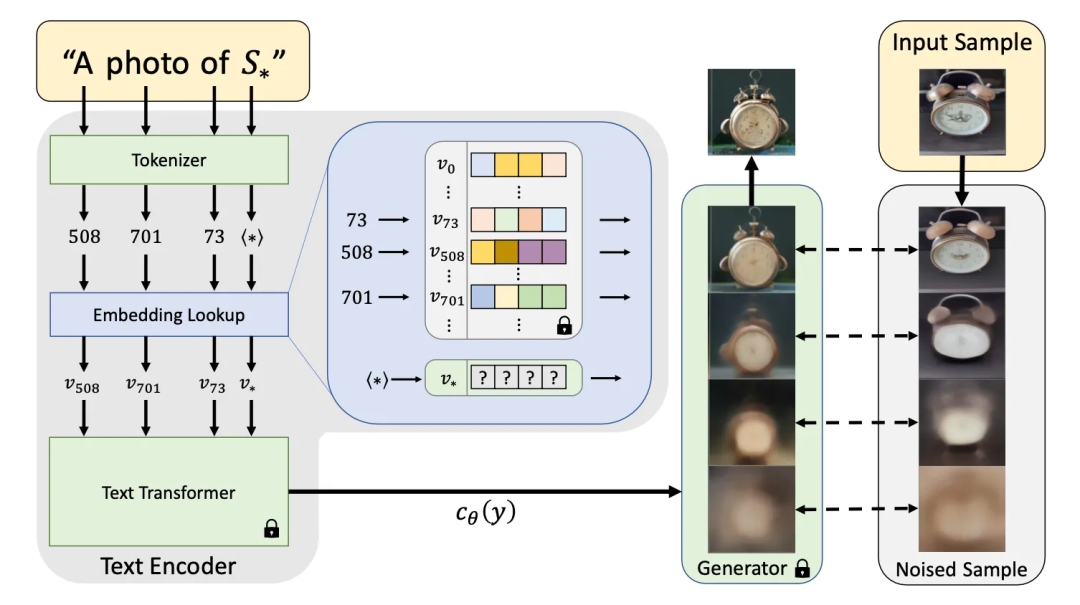 其实原理上很简单,从图中可以很明显看出来,作者把整个 Generator 部分都冻结,以及整个 Text Encoder 中的 Transformer 也冻结,其他词的 embedding 也都冻结,最后只留下目标词的 embedding 会参与到梯度更新中。