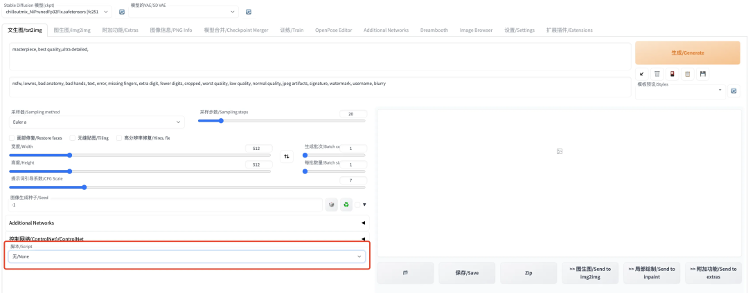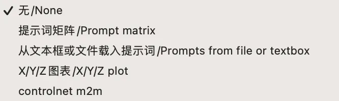 在 text2image 页面的左下方提供了脚本的选择。这里的脚本其实就是保存在stable-diffusion-webui/scripts/路径下的 python 脚本文件,目的就是为我们提供了一些方便的功能。