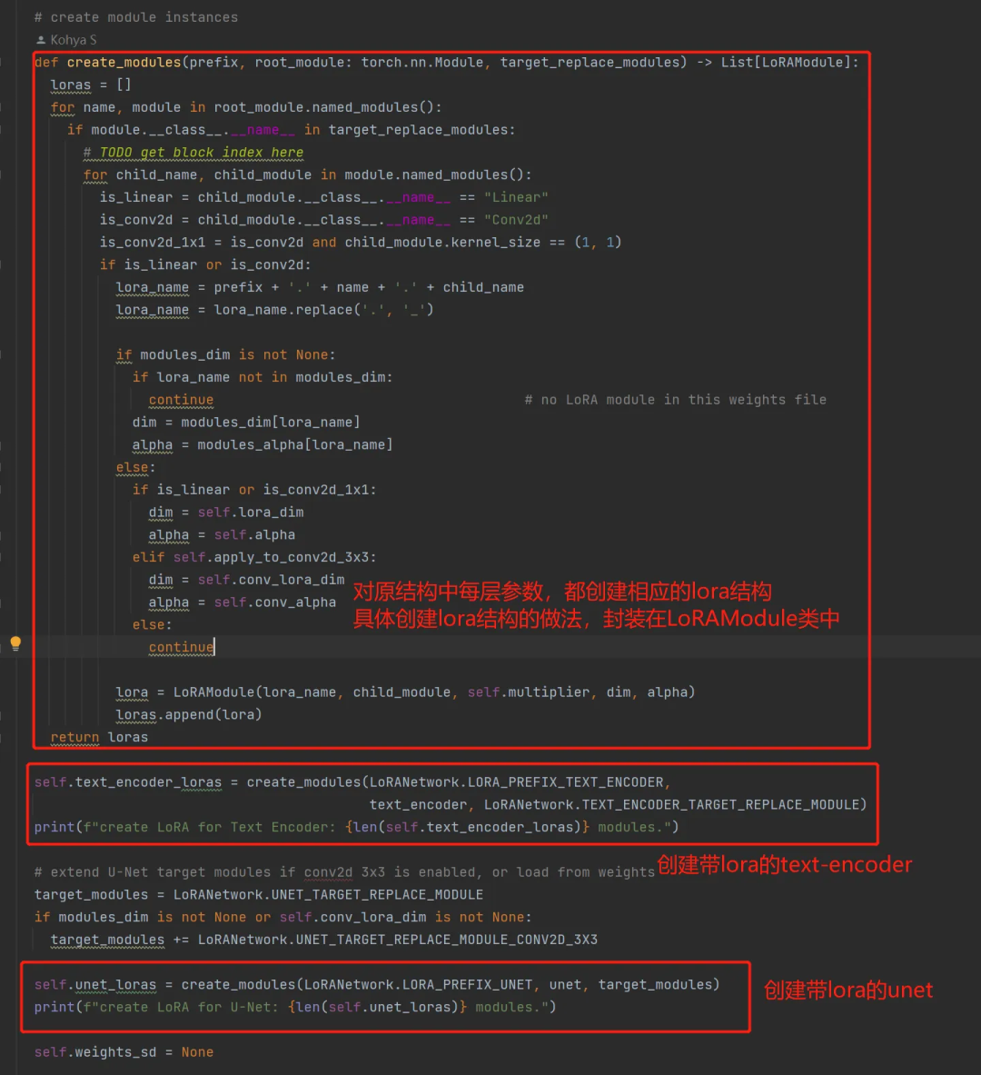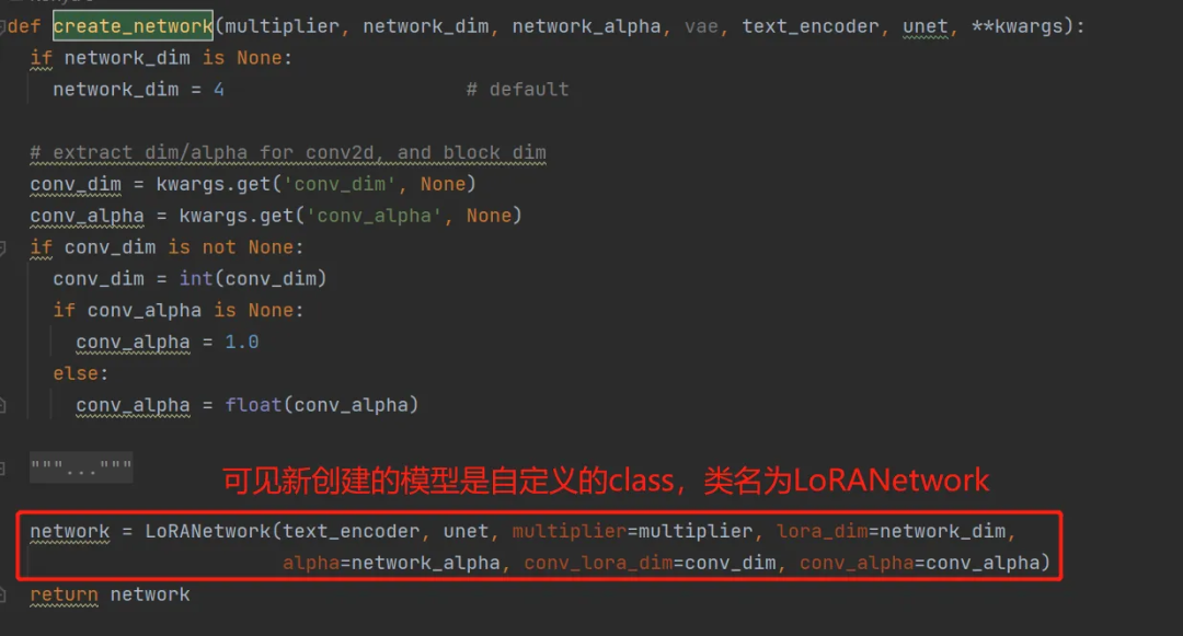 然后我们具体看下creat_network这个函数内部,如何创建新的 lora 模型的,脚本在lora-scripts/sd-scripts/networks/lora.py。