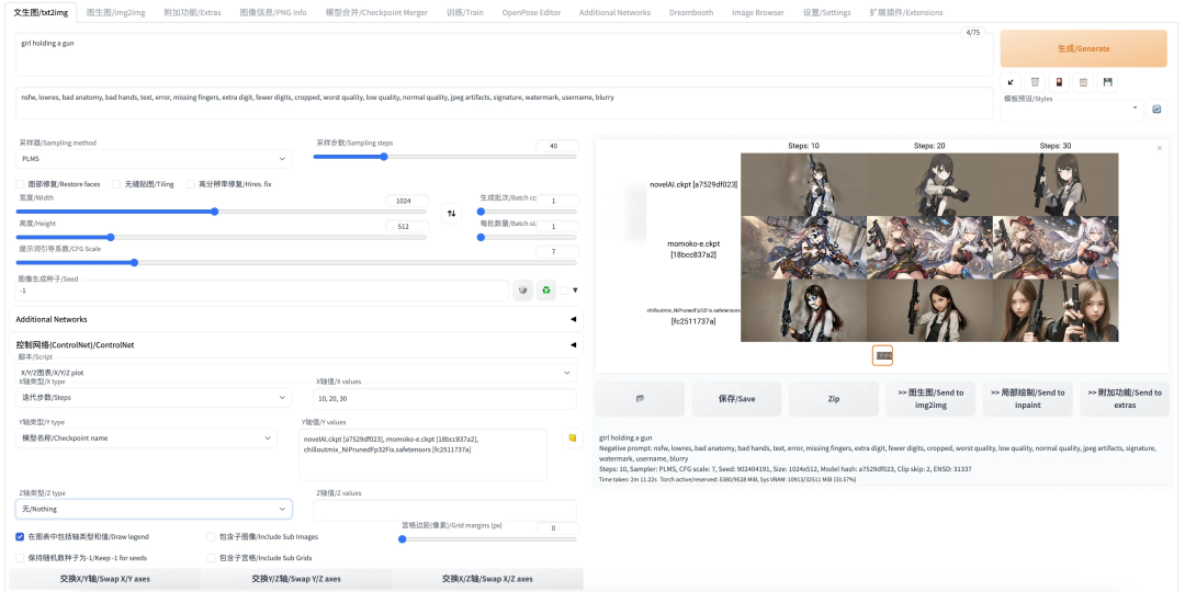 X/Y/Z 图表 :针对特定 prompt,对比不同纬度的参数取不同值时的效果。如下例中,我们选用 prompt 为“girl holding a gun”,然后对比三个模型以及 10,20,30 三个不同采样步数的效果: