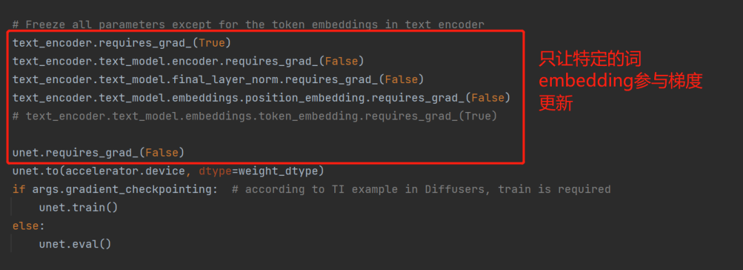 因此可以看出,textual_inversion 的训练,实际上是更加纯粹的一种方式。仅仅是通过参数冻结的方式,更新特定词 embedding 来进行训练。