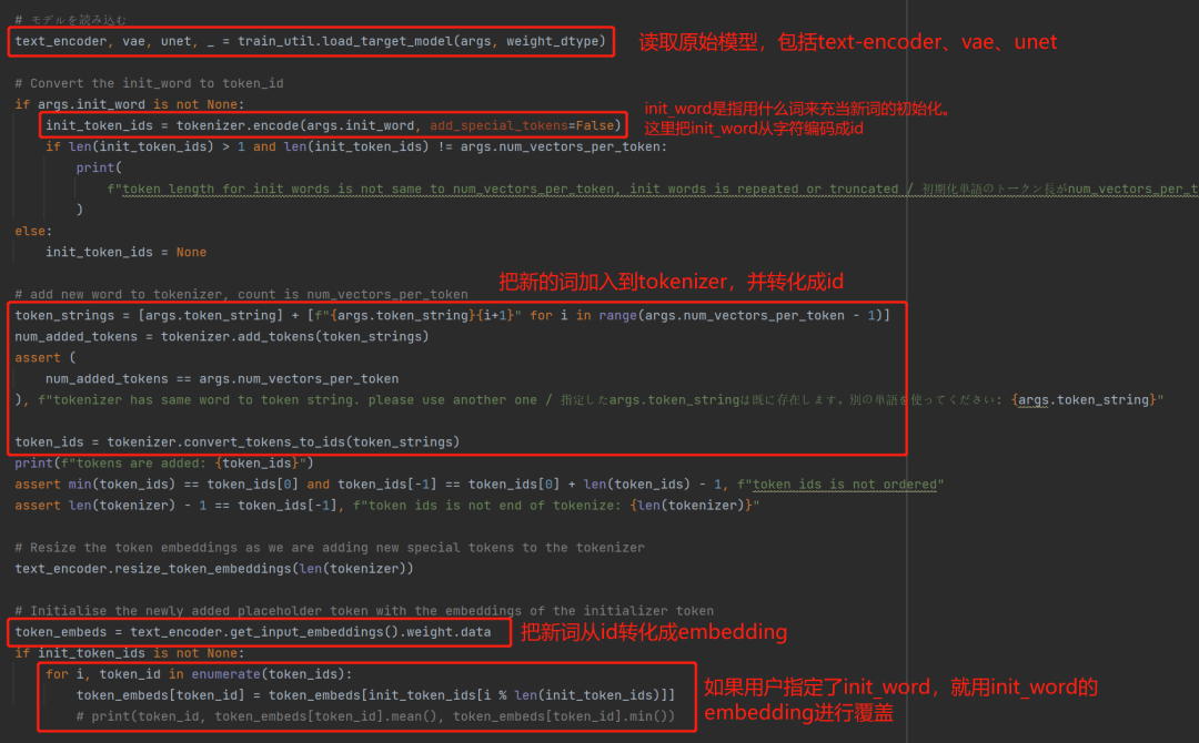 在 sd-scripts/train_textual_inversion.py 脚本中可以看到训练过程代码,整体流程上与前文的 LoRA 训练是差不多的,但是有几点关键不同: