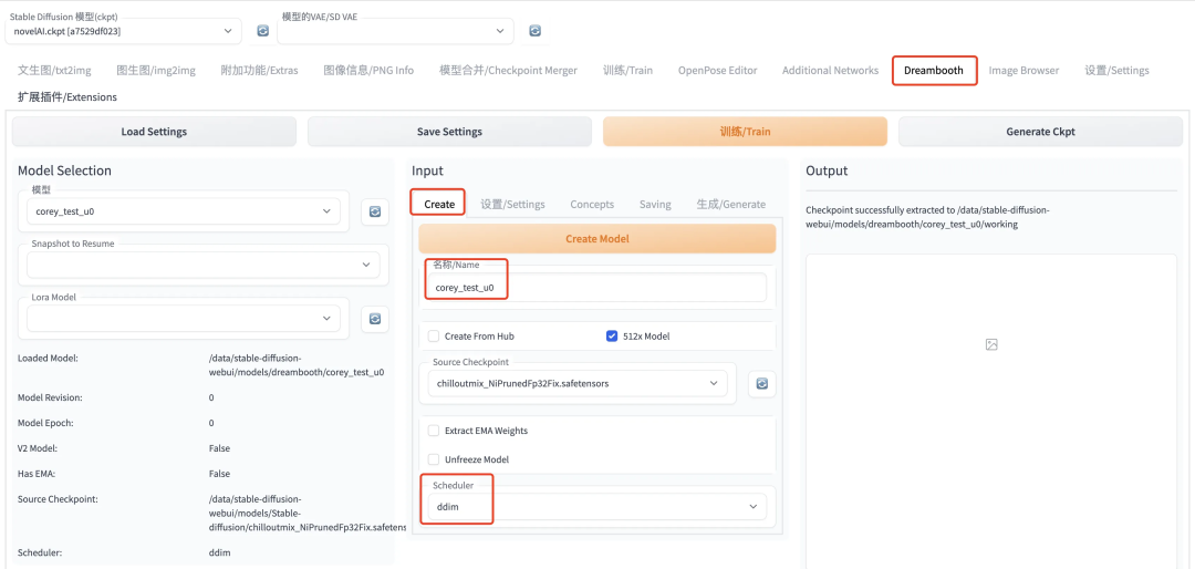 其中,Source Checkpoint 参数就是选择哪一个模型的参数作为初始化模型参数,模型路径为:stable-diffusion-webui/models/Stable-diffusion/下的 ckpt 文件模型。而所谓 Scheduler,也就是采样器,就是选择扩散模型的形式。都设置好之后,点击黄色的 Create Model,再等一会就能看到创建好的模型了。这时在 Output 处可以看到 successfully 的日志,以及在左边 Model Selection 处可以看到自己刚 Create 出来的模型。