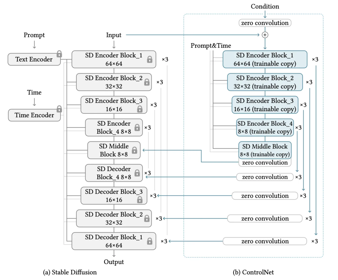 The trainable and locked neural network blocks are connected with an unique type of convolution layer called "zero convolution", where the convolution weights progressively grow from zeros to optimized parameters in a learned manner.