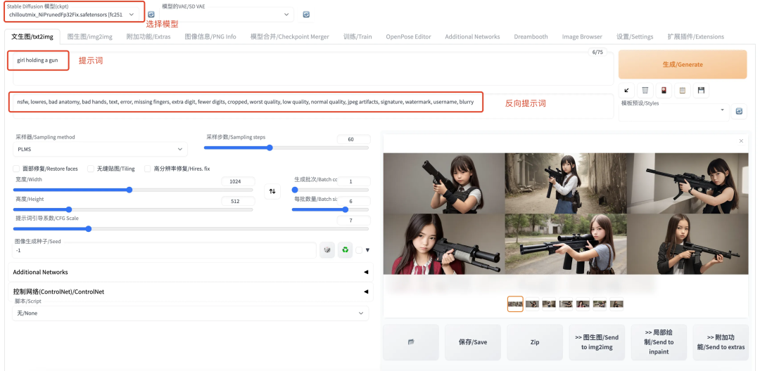 这样输入相关参数后,可以看到 girl holding a gun 作为 prompt,所生成的 6 张图片