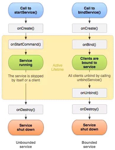 Service 有两种不同的启动模式 ,不同的启动模式对应不同生命周期。两种不同 Service模式的生命周期如下: