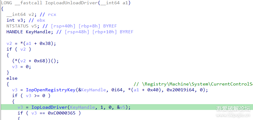 而分析上述调用路径的唯一作用,就是为了得到 IopLoadDriver参数的意义。(注册表的 Handle)