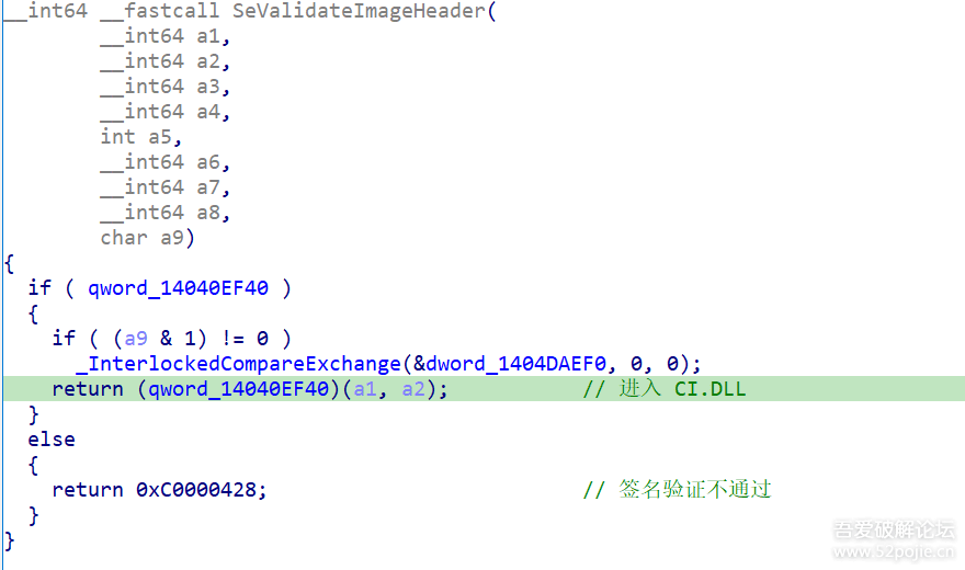 通过 SeValidateImageHeader进入 CI.DLL 进行签名校验,CL.DLL 部分就不再继续跟了,我们主要看如何进入CI.DLL: