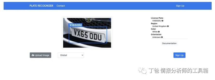 车牌识别器:https://platerecognizer.com/车牌识别器使调查人员可以上传车辆牌照或车辆的图像到识别与上传图像相关的信息。要使用此工具,请单击“上传图像”按钮并从您的设备中选择车辆或车牌的图像。当上传车牌图像时,车牌识别器会检测图像中的车牌,并返回结果,包括车辆注册的区域和车牌的颜色。![]()