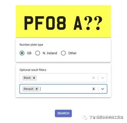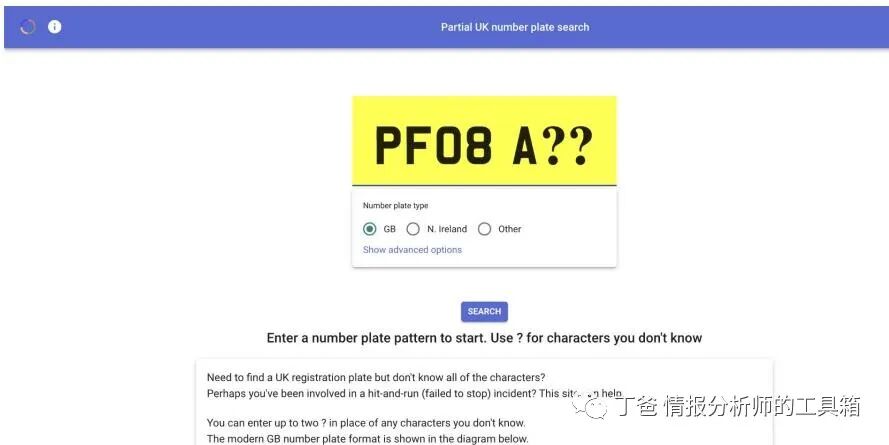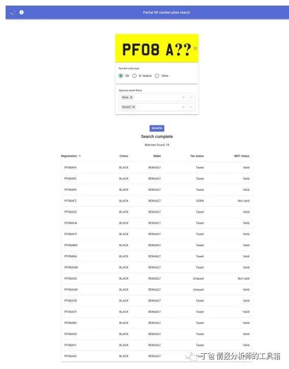 部分英国车牌搜索是一个系统,使调查人员搜索部分VRM的车辆注册在英国。与在警察国家电脑(PNC)上进行车辆查册一样,输入车辆登记号码时,最多可输入两个未知字符,以问号形式记录。https://www.partialnumberplate.co.uk/部分英国车牌搜索查询英国注册车辆的驾驶员和车辆牌照机构(DVLA)数据库,即车辆查询服务。https://vehicleenquiry.service.gov.uk/目击者经常会提供部分缺失字符的车牌。张贴在互联网上的车辆图片也可能有部分车牌被蒙住或遮盖。使用部分英国车牌号码搜索,英国车辆可以查询和过滤到可能的匹配。标准的英国车牌,使用两个字母、两个数字、一个空格和另外三个字母的格式,应该使用GB选项输入。当搜索北爱尔兰注册车辆时,通常是三个字母后面跟着四个数字,点击N. Ireland复选框。最后,当搜索自定义车牌时,选择“其他”复选框,这使调查人员能够输入遵循不同格式的车牌。车牌中的任意两个字符都可以作为未知问号输入。![]()
