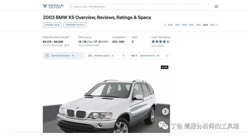 “车辆历史”(Vehicle History)提供了该车从多个角度拍摄的照片,这些照片可以与用户在网上发布的照片进行比较,从而确定该车的确切型号和生产年份。![]()