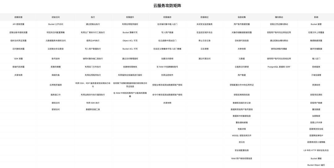 上图为火线云安全知识库的云服务攻防矩阵,以下为我自己所整理的云服务所面临的安全问题大概,后面会根据此框架详细讲解安全问题。