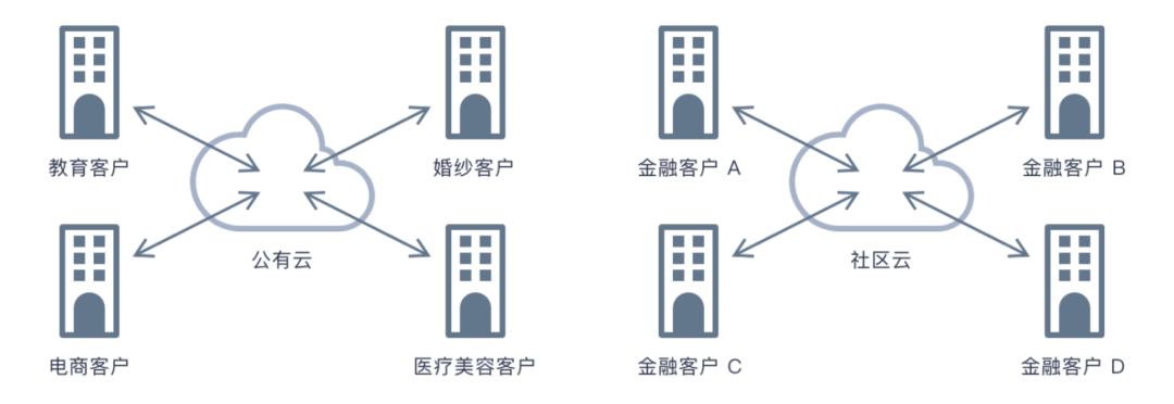 特定组织或行业共享使用的云计算服务方案,行业云是由几个具有类似关注点(例如安全性、隐私性、和合规性)的多个组织共享,像政务云、金融机构、医疗等特殊客户群体,需要满足其一定的行业规范和数据安全标准。