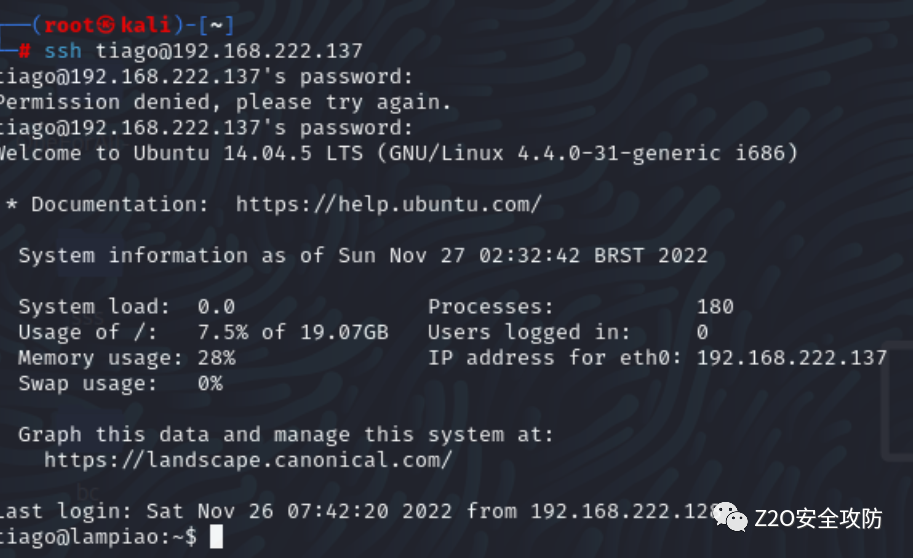 密码: Virgulino重要的来了!!!!使用用户名tiago进行ssh登陆连接,成功连接,但是不能用sudo su进 行提权!!