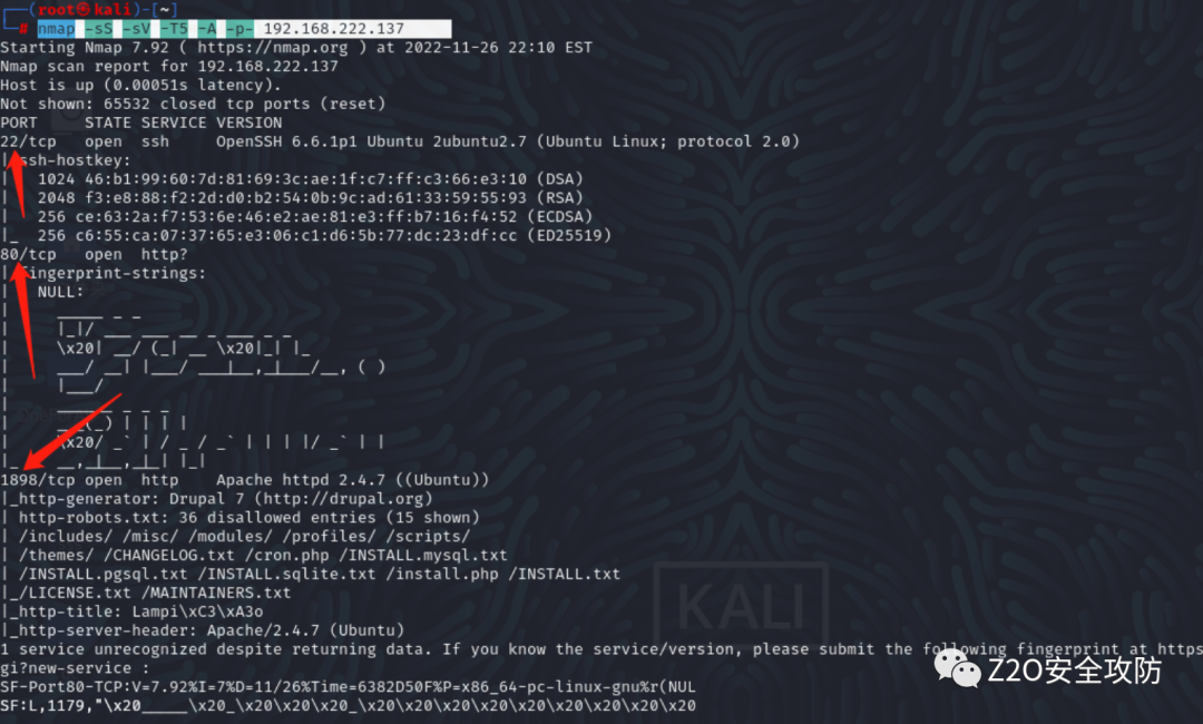 解释:(ip地址是你自己的物理机ip第三个小数点后面改0/24)得到ip后开始探索ip地址开放端口和一些服务。继续用nmap全端口扫描: