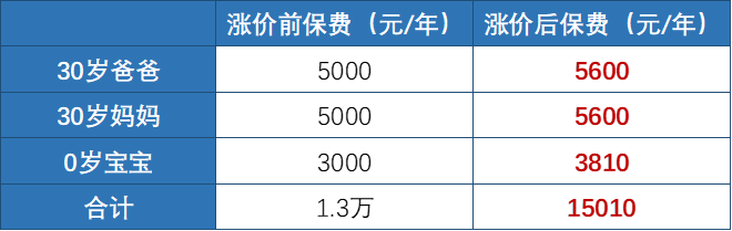 一家三口,假如爸爸妈妈原本保费分别5000,宝宝保费3000,一共1.3万/年。