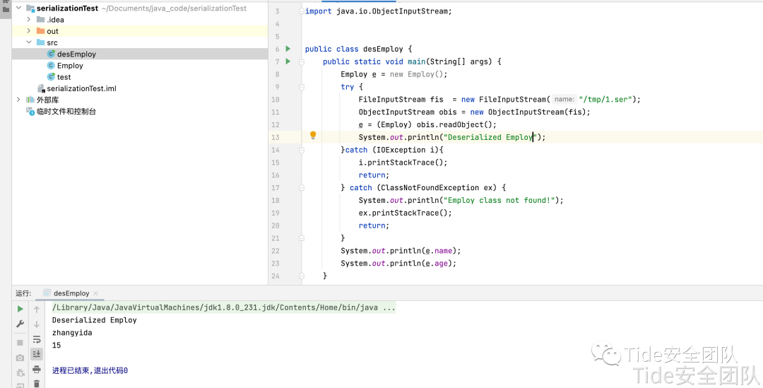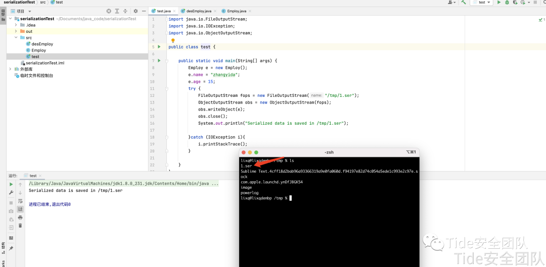 import java.io.FileOutputStream;import java.io.IOException;import java.io.ObjectOutputStream;public class test {public static void main(String[] args) {//将e转化为字节序列存储于/tmp/1.serEmploy e = new Employ();e.name = "zhangyida";e.age = 15;try {FileOutputStream fops = new FileOutputStream("/tmp/1.ser");ObjectOutputStream obos = new ObjectOutputStream(fops);obos.writeObject(e);obos.close();System.out.println("Serialized data is saved in /tmp/1.ser");}catch (IOException i){i.printStackTrace();}}}