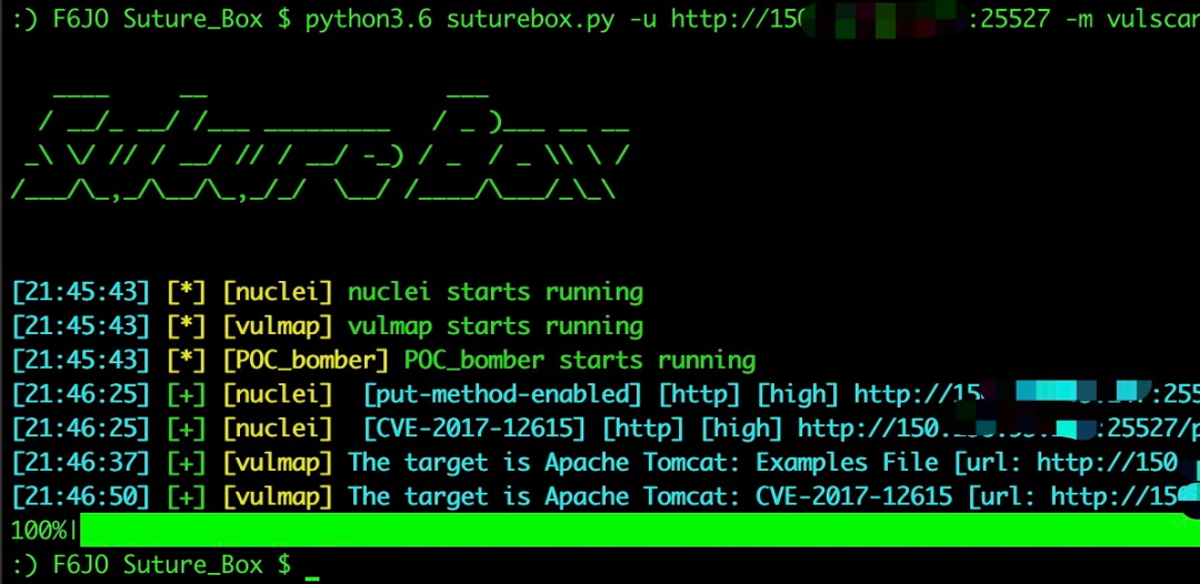 python3 -m pip install -r requirements.txtpython3 suturebox.py -u https://xxx.xxx.xxx/ -m vulscanpython3 suturebox.py -u https://xxx.xxx.xxx/ -m vulscan -t vulmappython3 suturebox.py -u https://xxx.xxx.xxx/ -m vulscan -x vulmap,nuclei