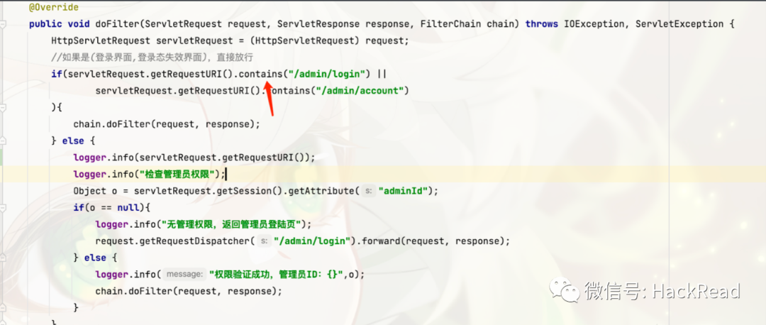 先直接看一下fliter,发现是用contains来判断url该不该放行,所以我们只需要构造类似/admin/login/../../xxx 这种即可绕过filter
