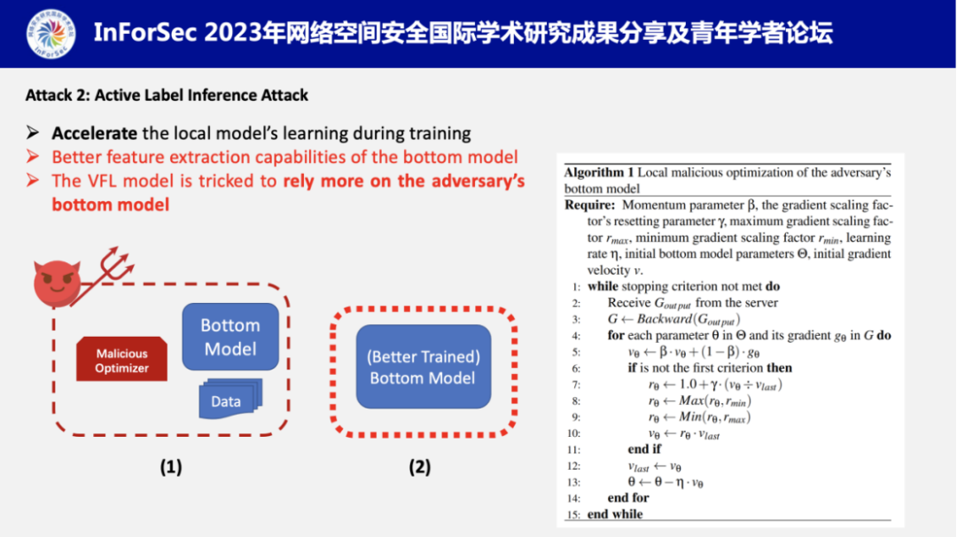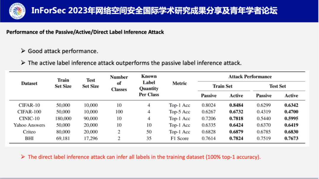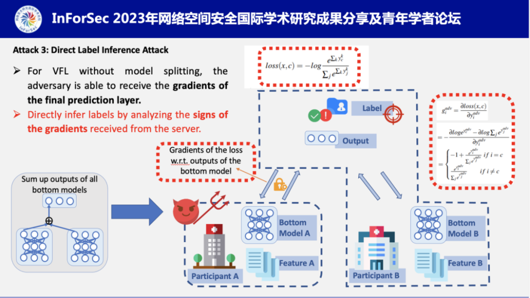 因此,付博士对垂直联邦学习场景下的隐私风险进行了重点研究。付博士认为垂直联邦学习在使用场景、联邦模型架构和训练算法等诸多方面与水平联邦学习大不相同,因此具有独特的隐私问题。具体而言,付博士揭示了垂直联邦学习中存在的一种新型隐私风险——标签泄露。在垂直联邦学习架构中只有一个参与者拥有样本的标签。垂直联邦学习必须确保标签的隐私性,因为标签可能是参与者的重要数据资产或者具有高度敏感性。垂直联邦学习中,恶意参与者发起标签推断攻击的动机可能是使用被盗标签建立与受害者类似的业务以进行商业竞争,或将敏感标签出售给地下行业牟取利益。