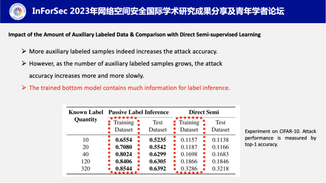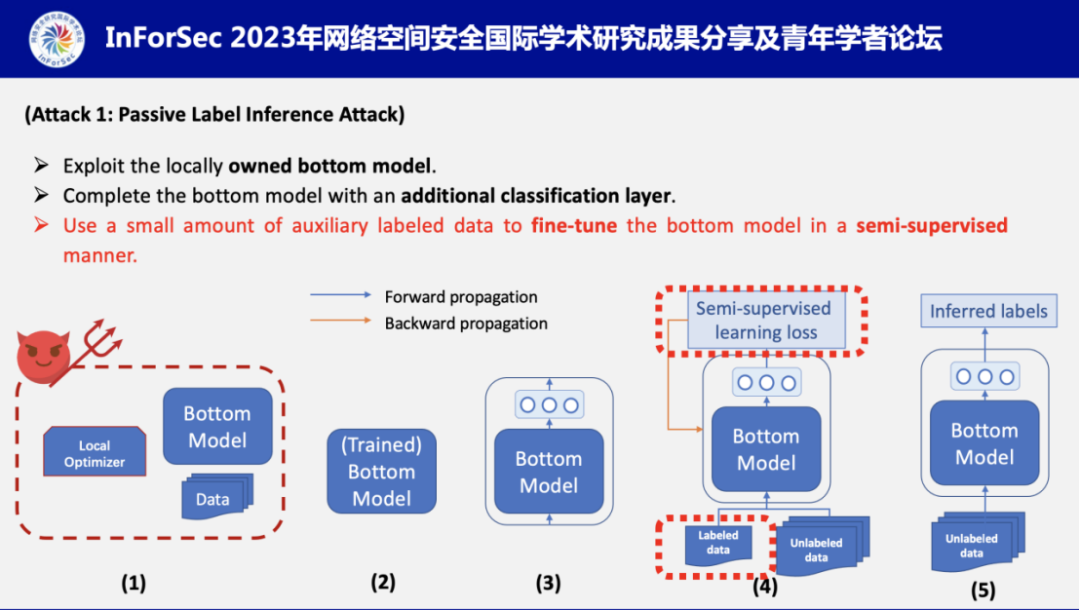 (1)为了利用训练完成的底部模型,攻击者可以采用一种基于“模型补全”的被动式标签推断攻击。实验表明,在少量辅助标记数据的帮助下,恶意参与者可以利用半监督学习将其训练的底部模型微调为完整的标签推断模型。