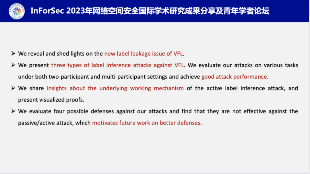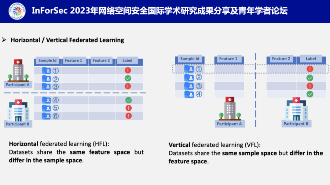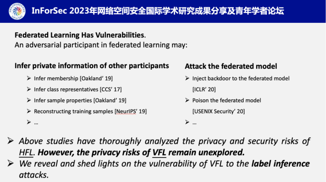 联邦学习被认为是一种能够保护各个参与方本地数据隐私的机器学习范式。然而,最近研究表明实际上联邦学习中依然存在间接的数据隐私泄露。付博士指出目前关于水平联邦学习中存在的隐私安全风险已有多个研究方向,例如水平联邦学习中的数据还原攻击、成员推断攻击、属性推断攻击和后门攻击,但是对于工业界中的应用同样越来越广泛的垂直联邦学习中的隐私风险鲜有研究。