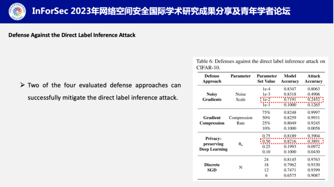 此外,付博士评估了四种可能的防御方法:梯度加噪、梯度压缩、隐私保护加固的深度学习 (Privacy-Preserving Deep Learning,简称PPDL)和离散的随机梯度下降(DiscreteSGD)。结果发现,尽管其中一些防御可以较为成功地抵御直接标签推断攻击,以上防御对于被动和主动式标签推断攻击缺乏足够的防御能力。