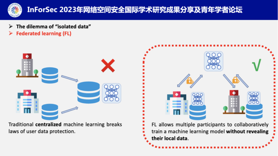 付冲博士首先介绍了联邦学习的应用背景。数据安全及隐私问题已经得到越来越多国家的关注,一系列出台的相关法律法规禁止任何公司将其储存的用户数据泄露给其他公司,导致互联网公司面临着“数据孤岛”的难题:如果多家公司想要互相合作,整合其各自拥有的数据以训练一个性能更好的机器学习模型,它们将面临违反法律的风险。针对这一困局,联邦学习(Federated Learning,简称FL)提供了一种解决方案。作为一种专注于数据隐私保护的分布式机器学习技术,联邦学习允许多个参与者通过周期性地交换中间计算结果的方式协作训练一个模型,同时不泄露每个参与者的本地原始数据。